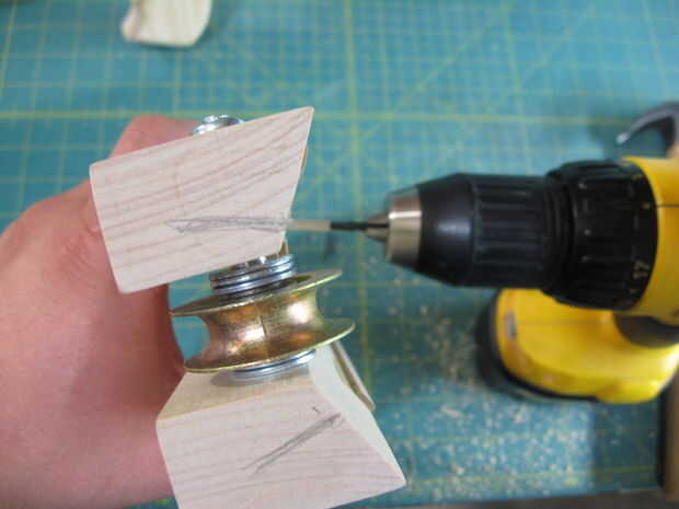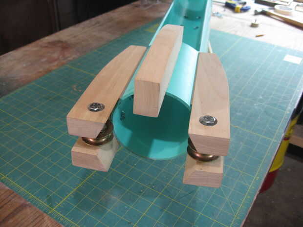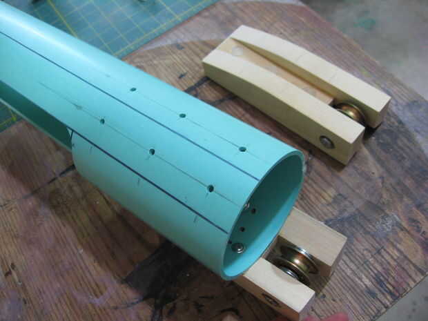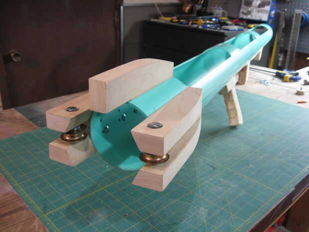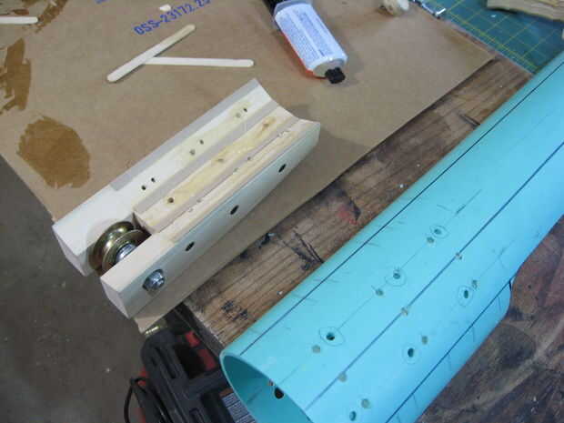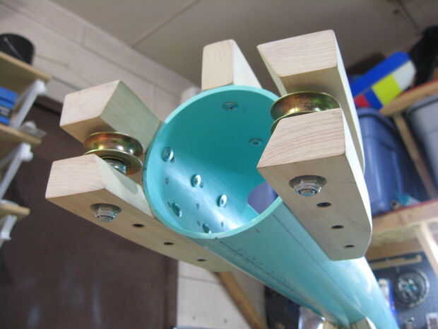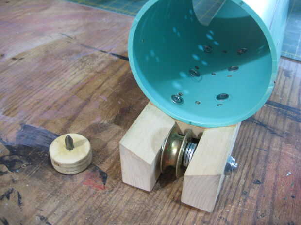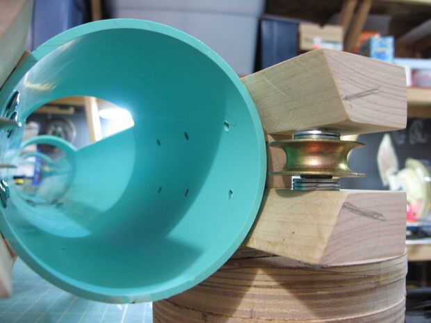Si nos fijamos en la parte delantera de la bazuca en algunas de las fotos, puedes ver un montón de agujeros adicionales. . Estos revelan cuántos intentos tuvo hasta tengo los soportes de polea colocados exactamente donde yo quería. (Resulta que esto no era tan sencillo como atornillar dos elementos planos juntos, eso es seguro!)