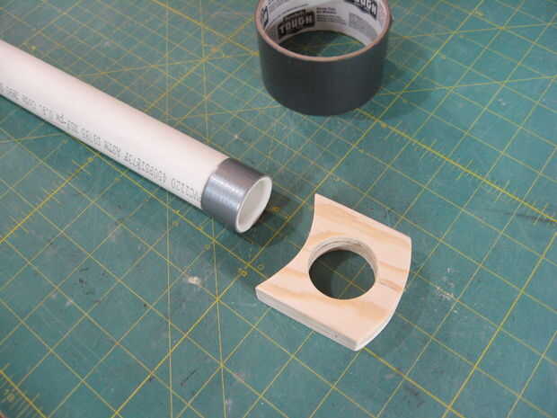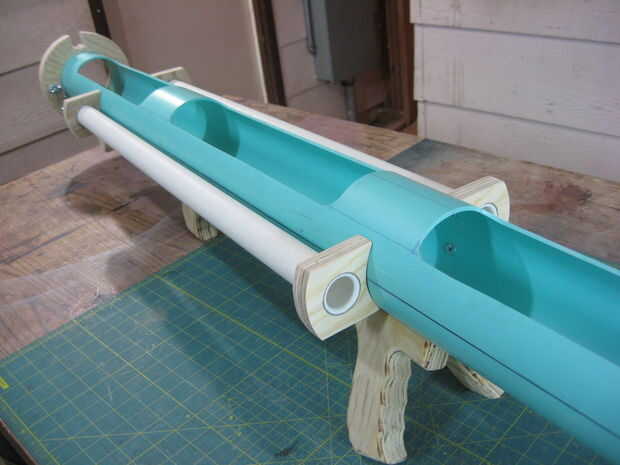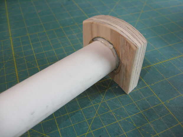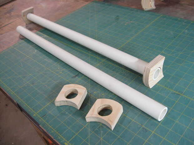 Soportes de madera fueron hechos de madera contrachapada. El PVC se pega a los soportes de madera y los soportes se atornillan al tubo principal.