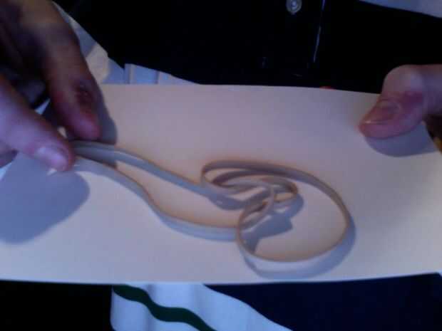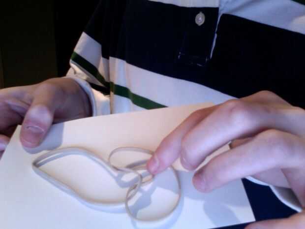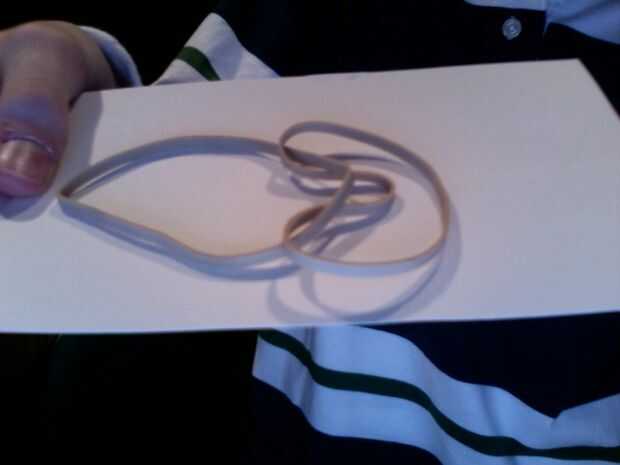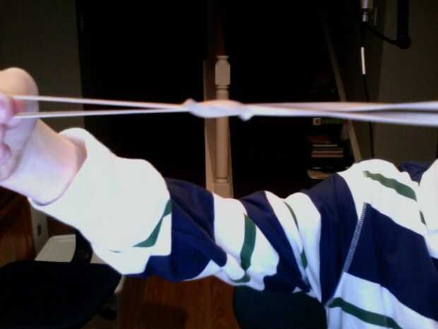 Tire hacia arriba, como en el último paso y al mismo tiempo alimentar la parte derecha superpuesta de la goma elástica a través de la goma izquierda "agujero". Cuando termine este agarre la parte de la goma derecha banda es alimentado a través con su mano derecha y con la mano izquierda, agarra el borde extremo izquierdo de la banda de goma con la mano izquierda. Tire hacia afuera simultáneamente. Debe apretar en un nudo, y ya está terminado. Si desea agregar más ligas sólo repita los pasos pero imaginer la doble banda de goma es una. me parece que no más de dos bandas de goma conectados uno al otro es lo mejor. Diviértete con tu bazooka de goma.