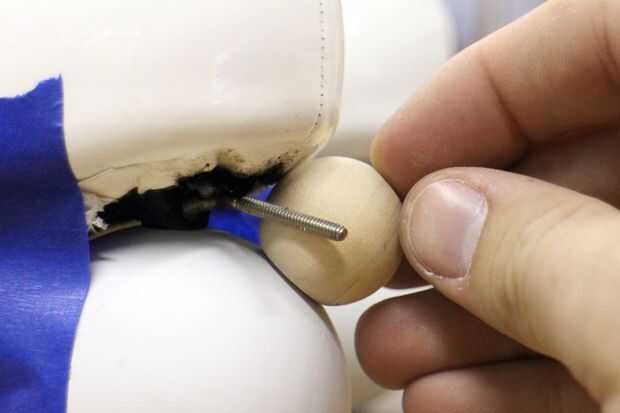 Después de comprobar mi perforación en la zapata me roció la cabeza con unas capas de imprimación luego había unido al post principal con más E6000. Temporalmente instalé la bola más grande de talón en el talón para obtener el derecho de espacios, y que la pelota de tacón podría giren libremente sin chocar con la cabeza.