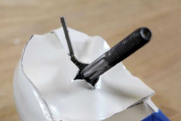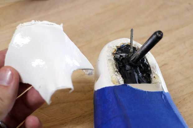 Utilizando la cubierta de talón de vinilo que había guardado desde antes cuando estaba tomando los talones, hizo una plantilla de papel para caber alrededor del poste de talón entonces había transferido ese patrón de plantilla a la cubierta de vinilo talón. El rastro fue cortado con tijeras y una abertura fue hecha desde el borde de la abertura del vinilo al centro que acomodaría el post de talón.