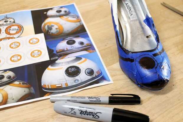 El dedo del pie cerrado de estos tacones son perfectos para embellecer a mirar como BB-8. Comencé buscando fotos del droide y a imprimir una hoja de referencia mostrando BB-8 desde diferentes ángulos algunas, ampliada Mostrar detalles de áreas seleccionadas y de unas fuentes diferentes para asegurarse de que tenía toda la información que necesitaba.