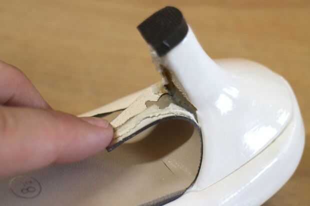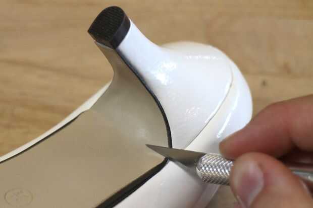 La suela de cuero del talón deberá ser cortado en el talón y pelado en preparación para el retiro del talón. Usando un cuchillo de la manía aguda que una incisión fue hecha directamente a través de la suela de cuero donde termina el talón en la parte inferior del calzado, el cuero puede ser cuidadosamente pelado apagado, revelando los bordes de la envoltura de vinilo blanco para el talón de la zapatilla.