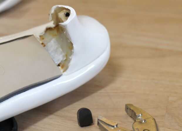 El pie de plástico duro en la parte inferior del talón puede ser torcido hacia fuera usando un par de pinzas. Guardar el pie de plástico como la necesitaremos más adelante.