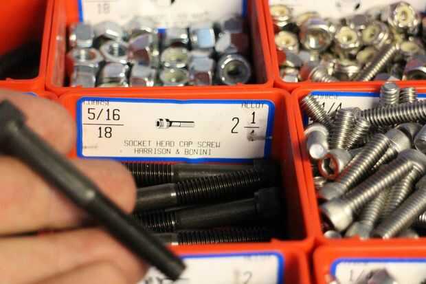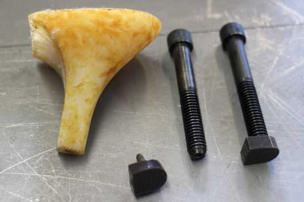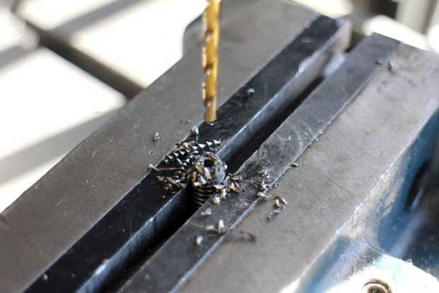El talón de nuevo fue hecho de un máquina tornillo de 5/16" que fue 2.5" de largo. Ya que quise usar los pies de plástico existentes desde la parte inferior del talón perforé una abertura correspondiente en la parte inferior de los tornillos que se insertaría en los pies. Esto hará sentido más adelante, pero debía hacerse antes de que los tornillos fueron atados a los zapatos.
