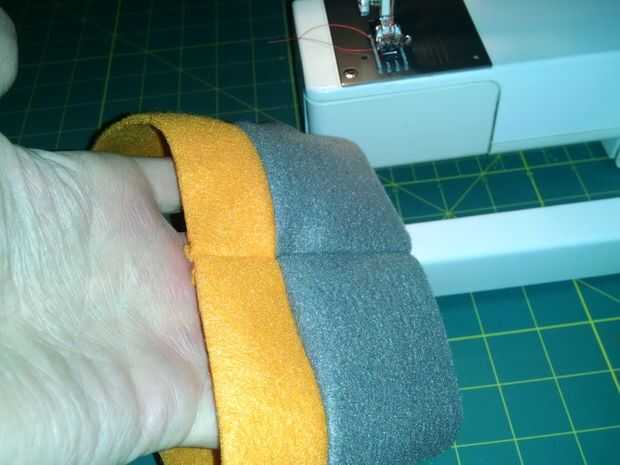 Doblar la banda de la oreja por lo que es el lado "bueno", luego coloque alrededor de la pieza blanca, "buen" lado a lado 'bueno', borde abierto para abrir el borde.
