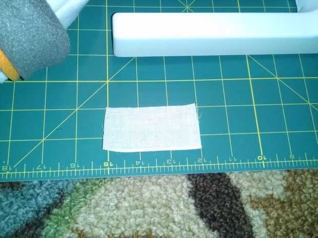 Si lo desea, corte 1" por 3" trozo de tejido ligero como muselina para usar como una etiqueta. doble sobre e inserte las asperezas entre la tela gris y naranja.