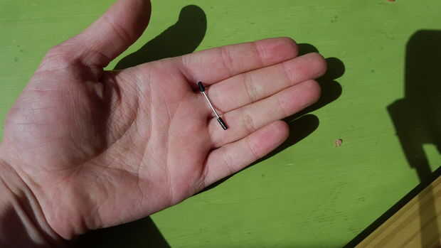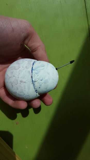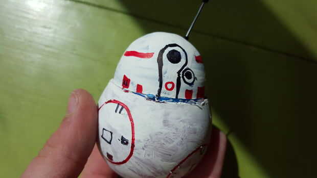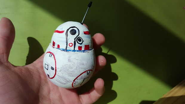 You're so close! Ahora, un pequeño trozo de cable y una antena como en la imagen. Usar sharpies para dibujar funciones de BB-8. Y por último, disfruta! Usted puede utilizar su BB8 como un lugar de almacenamiento, para guardar el cambio de bolsillo, o como un huevo de Pascua en una búsqueda de huevos!