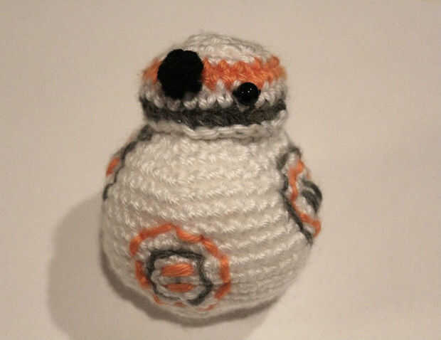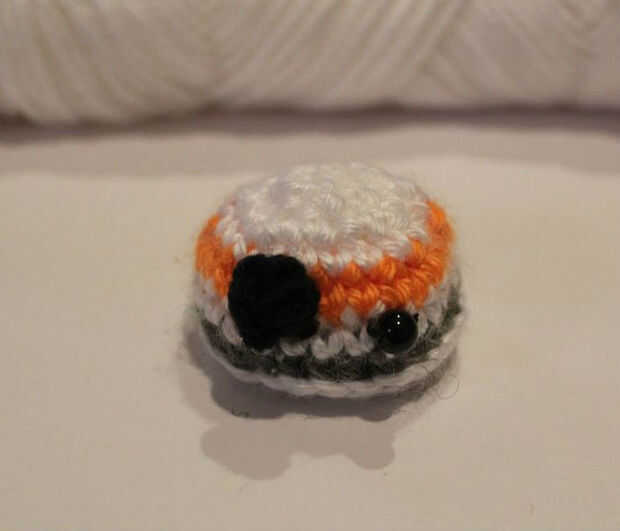 Con hilo negro y un gancho más pequeño, hacer un anillo mágico y sc ocho veces dentro. SL st al principio y coser el círculo sobre la cabeza del robot. Con una aguja de coser, coser el talón negro al lado del círculo negro más grande. Coser la cabeza sobre el cuerpo. Su BB8 es completa!