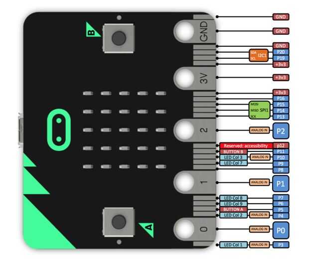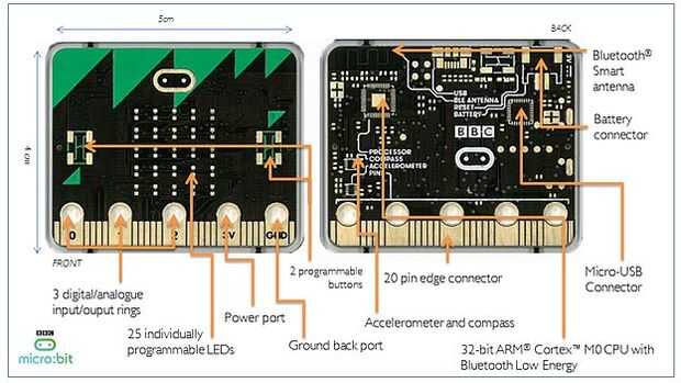 Mide 4 x 5 cm que el aparato tiene un procesador ARM Cortex-M0, Sensores acelerómetro y magnetómetro, conectividad Bluetooth y USB, una pantalla de 25 LEDs, dos botones programables, y puede ser alimentado ya sea por USB o un paquete de batería externa. El dispositivo de entradas y las salidas son a través de cinco conectores de anillo que forman parte del conector de borde del perno 23.