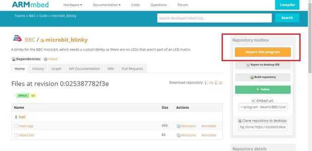 Como alternativa, puede utilizar mbed.org plataforma para desarrollar su código y compilar un archivo hex. Uso de plataforma de mbed.org: