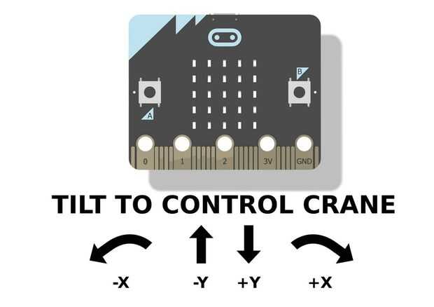Utilizando el acelerómetro en el BBC micro: bit para detectar en qué dirección está siendo inclinado (x o y eje) podemos alimentar esa información a los motores de la grúa. Si la BBC micro: broca se lleva a cabo con los LEDs hacia arriba Lee X y Zero: X e Y se convierten en mayor o menor (negativo), dependiendo de en qué dirección se inclina.