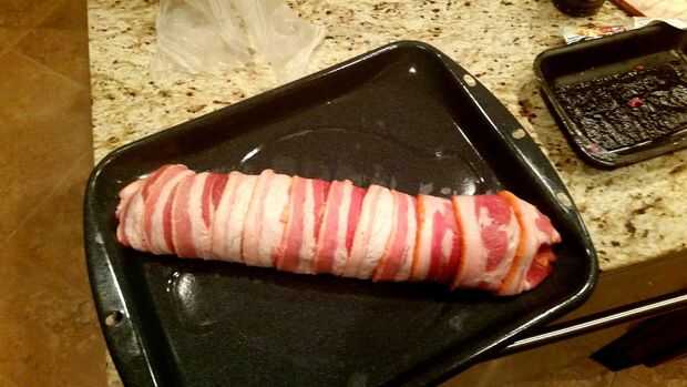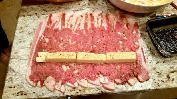 Otra vez pido disculpas por la falta de cantidades masivas de imágenes, pero bueno, no se puede tener todo. Poner en marcha la barbacoa! Saran de 350-400 ° F lugar abrigo abajo doble amplia con sobre una pulgada o dos superposición para cubrir una cantidad decente de su mostrador, más mejor. Picar encima de la cebolla dulce. En un recipiente mezclar la carne molida, la cebolla y los condimentos (yo también uso una cantidad gratuita de sal y pimienta). Colocar las tiras de tocino verticalmente sobre el abrigo de saran un poco ligera de superposición en cada pieza. Extiende la mezcla de la hamburguesa encima el tocino dejando sobre una mitad de pulgada a 1 pulgada en la parte inferior y dos caras. En la parte superior dejar 2 a 3 pulgadas, esto se utilizará como una aleta final para sellar el rollo. Cortar el queso gruyere en lo que sólo puedo explicar que registros. Coloque el queso sobre pulgadas arriba desde el fondo de la carne de hamburguesa, dejando por lo menos una pulgada en cada lado (Esto evitará que el queso filtrando durante la cocción). Utilice el saran para ayudarle a doblar sobre el borde inferior sobre el queso y enrolle para arriba asegurándose de no rodar el saran en él. doble y presione los extremos de modo que ellos estén completamente sellados, así que queso astuto no puede escapar. Colocar en una cacerola y llevarla fuera.
