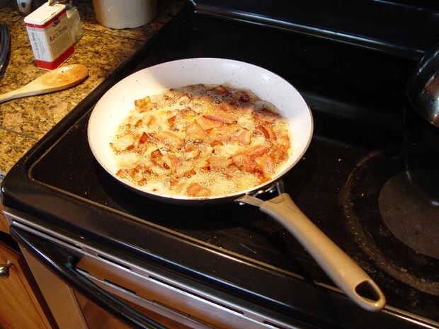 Cuando el tocino esté listo, escurrir la grasa y añadir a la mezcla de carne de cerdo.