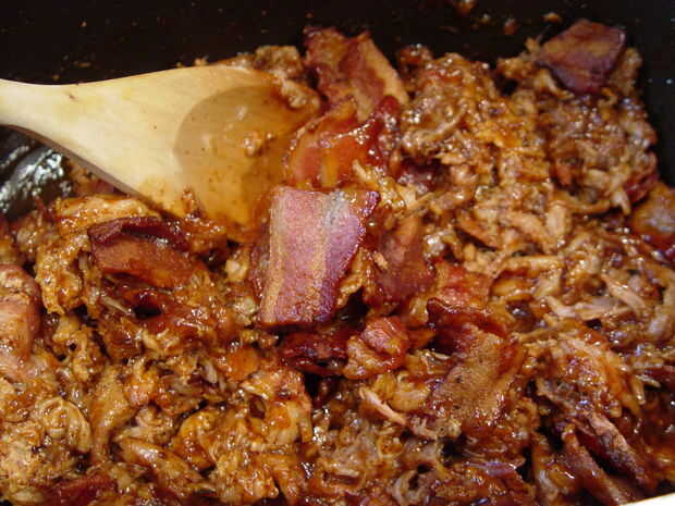 cociné el tocino con la carne de cerdo sólo para asegurarse de que todos los sabores mezclados, pero después de varias horas de cocción lenta el tocino necesita tostar encima. Cuando se hizo la carne de cerdo me pone en una tabla de cortar para desmenuzar y poner el tocino en una sartén saltear cocinar un poco más así que se consigue fresco.