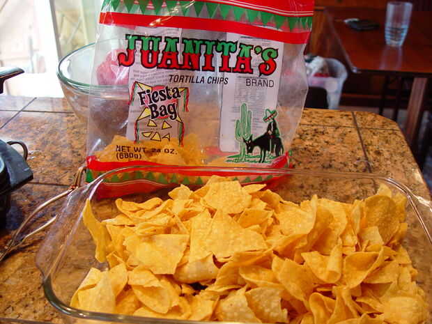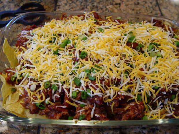 En una cacerola de 9 "x 13" colocar una buena capa de totopos. Luego la mezcla de tocino y carne de cerdo. Superior con algunas cebollas verdes en rodajas. Añadir el queso en la parte superior. Hornear durante unos 15-20 minutos o hasta que el queso se haya derretido.