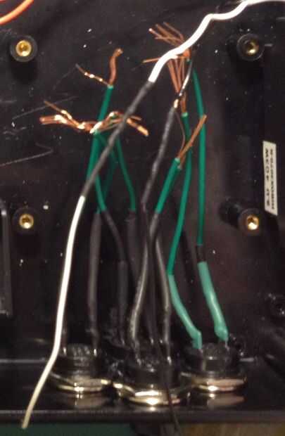1. Preparar los cuatro botones que se describen para el interruptor de eje de balancín en el paso 3, el paso 5, colocar dos medias longitudes de tu tercer color del cable (no negro o rojo), pelado en los extremos. Elegí verde para mi tercer color.
