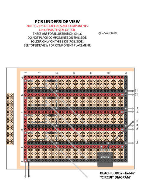 El esquema universal describe las conexiones; el colorido diseño incluye puntos de soldadura y diseño de componentes en el tablero.
