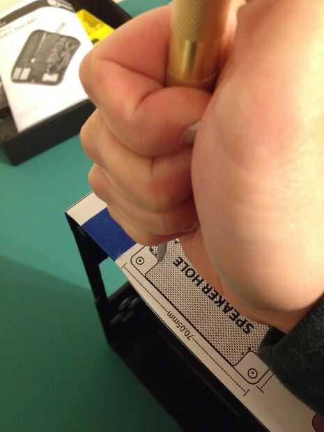 - Cinta la caja con cinta de los pintores, para ayudar a distribuir la tensión generada por la perforación y corte la caja ABS con herramientas eléctricas. Luego, con cinta adhesiva la plantilla recortada hacia el exterior de la caja.