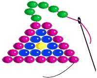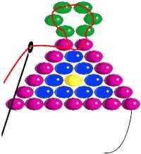 Bajar la aguja por el grano superior derecha y luego regresando por la tira superior izquierda. Ejecutar la aguja y el hilo en este bucle varias veces para la fuerza. Se muestra el bucle, pero el hilo no debe mostrar en su pendiente.