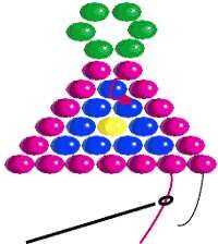 Traer la aguja hacia abajo a través de grano siguiente. Entonces traerlo bajo un hilo de conexión de cualquier dos granos cercanos. Correr alrededor y a través del lazo para hacer un pequeño nudo; tirar de él firmemente, pero no demasiado duro. Debe desaparecer en su tejido. Pase la aguja más granos en un ángulo en la parte inferior; sacar y cortar este hilo.