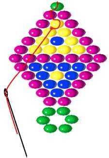 Continuar abalorios hasta que termine el pendiente. Enhebre el hilo a través de los granos y ate, como en el paso 11. Hilo se ejecutará a través del centro de granos como en la ruta que se muestra en esta imagen, aunque el camino no tiene que ser el mismo que esta. Una vez más, el hilo no se mostrará. El nudo debe desaparecer otra vez en el tejido.