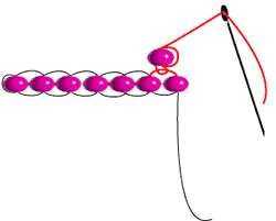 Ahora recoger un cordón con la aguja y deje que se deslice hacia abajo el hilo. Traer la aguja con el hilo de tender un puente sobre los dos últimos granos, luego hasta la parte inferior del talón acaba de agregar. Tiro tenso; debe terminar como este diagrama.