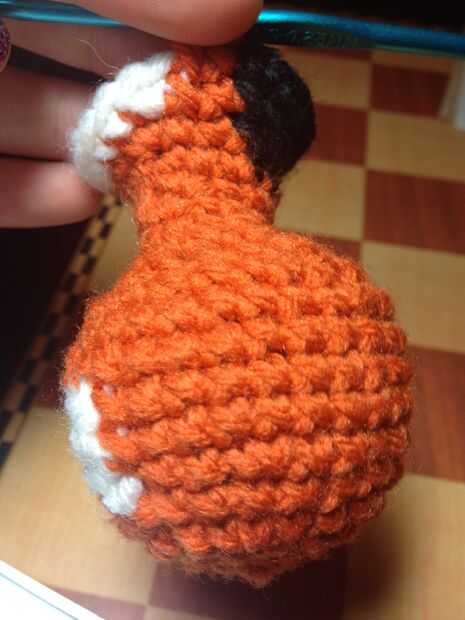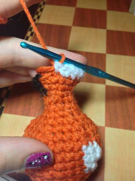 2SC, sc, sc, 2sc, sc sc (conmutación a naranja), 2sc, (en el 2 º interruptor negro) sc, sc, 2sc, sc, sc, 2sc, sc, sc, sc 2sc (en el 2 º interruptor naranja), sc (interruptor blanco)