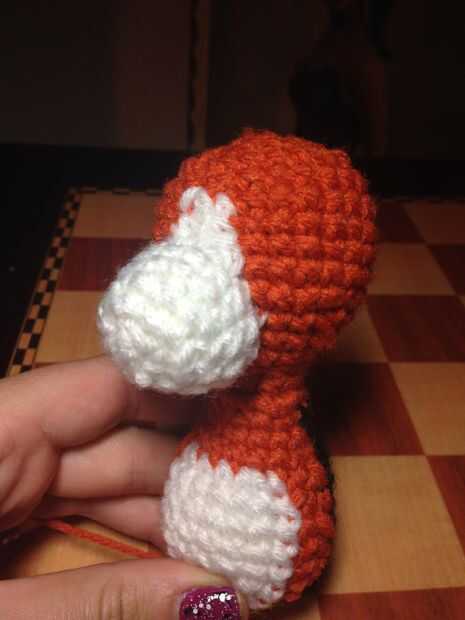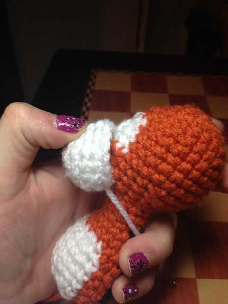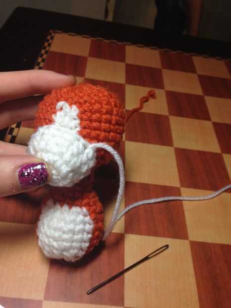 Utilizando una aguja de hilo, use la cola de hilo para sujetar el hocico justo debajo de la marca blanca en la cabeza.