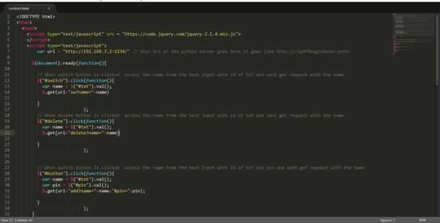 Si el código python que os adjunto, puede verme hablando de solicitud GET. Una solicitud GET es básicamente una manera para que una página web para comunicarse con un servidor. Para agregar, eliminar y cambiar las salidas estamos utilizando Jquery para hacer algunos básico Obtén solicitudes. He adjuntado una página html que hace justamente eso y también he comentado el código para su conveniencia.
