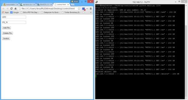 Ahora ir al archivo control.html y abrir con google chrome o cualquier otro navegador que usa, usted tendrá una página web con 3 botones y 2 cajas de texto. El cuadro de texto número de pin le pide el número de pin como P8_10 o P8_29, etc.. Necesita tener el nombre de llenar para poder usar el borrar y cambiar botones. Ahora que tienes control de web puede utilizar este ejemplo para crear un panel más avanzado. Tal vez usar las capacidades de la base de datos para utilizar su Beaglebone Black como un registrador de datos o uso para la automatización del hogar, las posibilidades son infinitas. Si te gusta este instructable entonces por favor voten por este proyecto en el concurso de creaciones codificados y favoritos también este proyecto. Gracias por leer este instructivo y en mantener hacking! :)