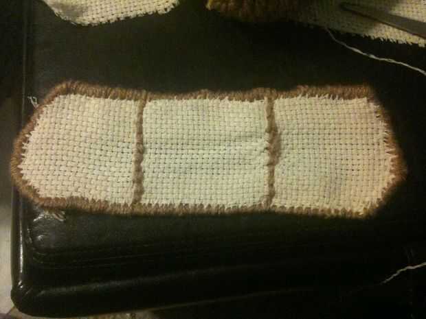 Corte una forma bandaid de su tela.  Utilicé tela de monje que tiene un gran tejido suelto e hilo de rosca a través de la creación de las líneas y bordes.