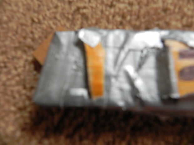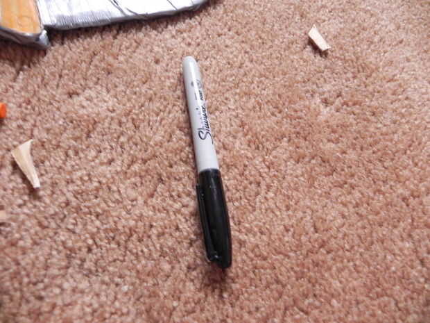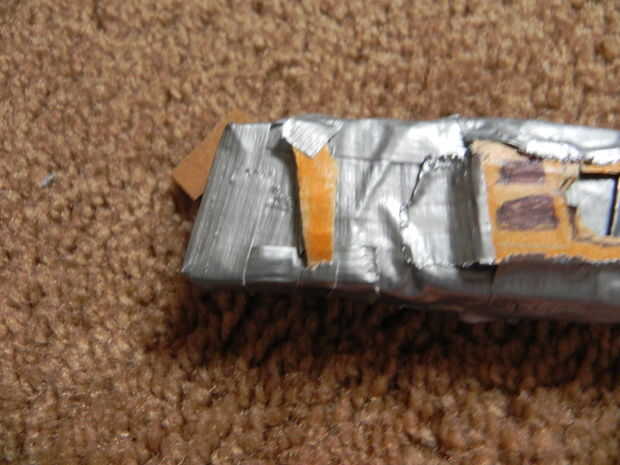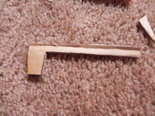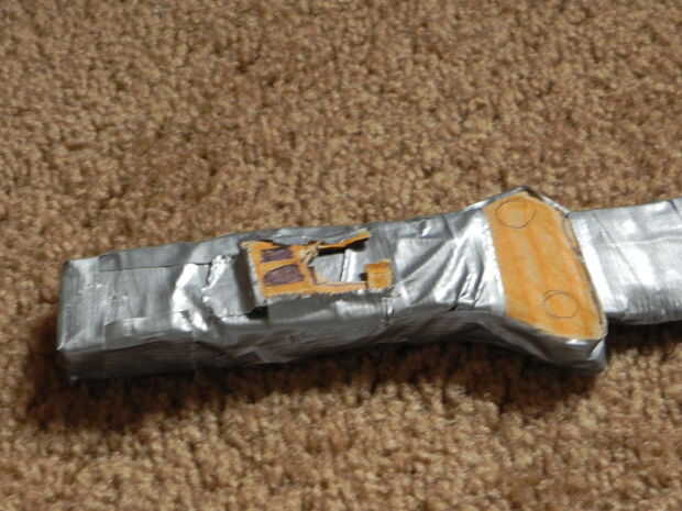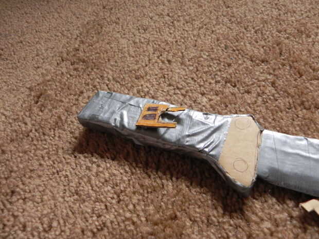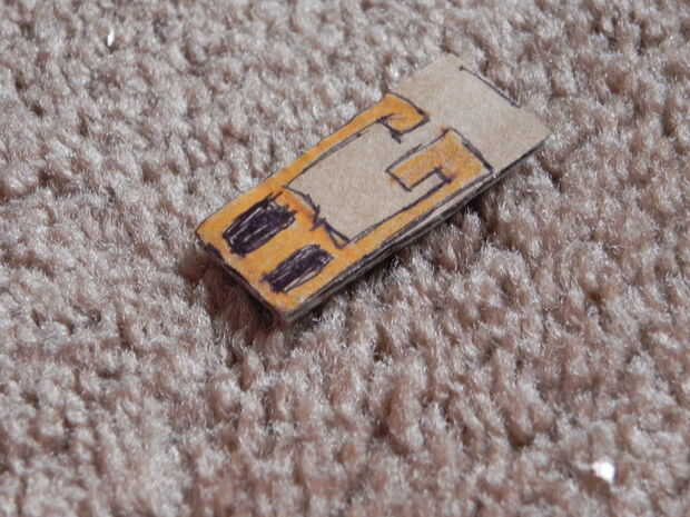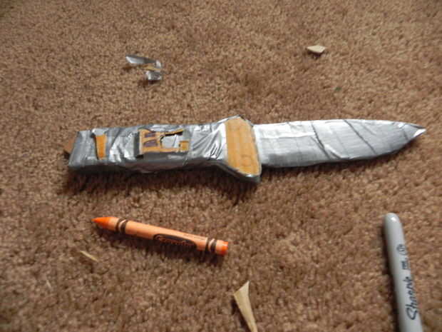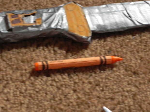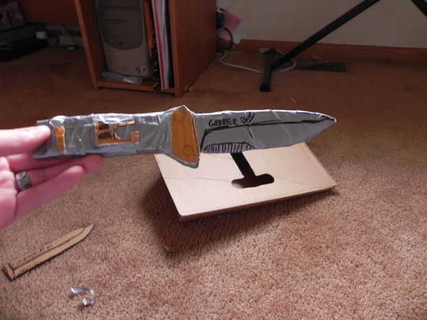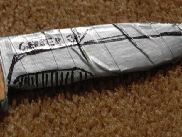 En el paso tres, vas a hacer el símbolo de Bear Grylls. Por desgracia, no tengo planos para que usted pueda rastrear el BG. Pero como se puede ver en la imagen, es sólo a B y G que están conectados. Desea dibujar dos de ellos en la cartulina con lápiz le. Después de dibujarlas, colorearlas con la tiza naranja. Desea cortar cuidadosamente hacia fuera. Utilice la cinta de pato para conectar uno a cada lado. Había grabado en los bordes del símbolo a la manija dándole el pop efecto de carta. A continuación, cortar dos líneas y los de color naranja. Tienen que ser la la misma longitud que la anchura de la empuñadura. Mira las fotos de esclarecimiento. Las líneas a la manija de la cinta. Ahora, toma tu sharpie y dibujar sobre la hoja. Tienes que escribir GERBER y trace una línea debajo que se extiende hasta la punta de la hoja se dobla hacia la parte inferior de la hoja cerca de la manija. Trazar surcos de Sierra pequeña en la parte inferior de la hoja. Luego escribe oso junto a GERBER diagonalmente.