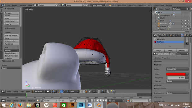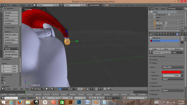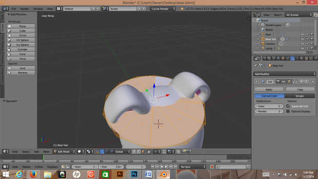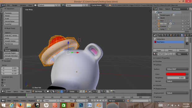 Los sombreros de fiesta se formó de un círculo, con la opción de ventilador de triángulo. Los doce triángulos facilita el modelado. Empecé con el oso. Después de probar el sombrero cubriendo un oído, había encontrado que no estaba demasiado interesado en que el diseño. Así que, decidí alisar el sombrero a reducir hacia abajo un poco y colocarlo directamente entre sus oídos.