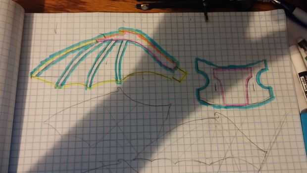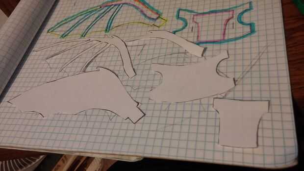 Para hacer las alas, utilizar papel carbón para hacer una plantilla desechable y trazar en una hoja de papel blanco. Usted puede tener un tiempo más fácil impresión de fotografías de mis diseños y las formas de corte. El papel de gráfico tiene cuadrados pulgadas de trimestre, pero las alas tendrán que ser de diferentes tamaños para diferentes dragones.