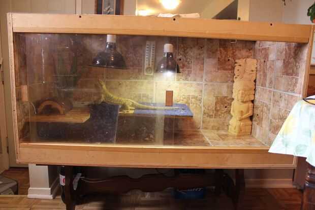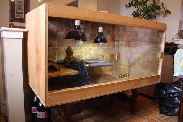 compré mi novio un dragón barbudo hace 3 años. Construyó su gabinete y se ha servido bien. El recinto es 4' amplia y profunda de 2' 2' alto. Este es un tamaño ideal para un dragón barbudo (normal) de adultos completamente crecido. Sin embargo Goliat está lejos de normal. Él tiene una cosa para la ventana de la sala de estar. Él ama tendido sobre una almohada en el alféizar de la ventana y deambula por la sala de estar. A veces él se pone detrás de mi PS3 y tomar una siesta. Él duerme en su jaula por la noche y se tome el sol sobre su roca por la mañana pero por la tarde que es rayar en sus puertas. Cuando nos deslizamos queden abiertas, arrastra hacia fuera y hacia arriba de la rampa en el alféizar de la ventana, donde él solo mira afuera todo el día. Incluso compramos una segunda bombilla UVB de calentamiento mientras que fuera de su jaula. Su recinto se ha convertido en nada más que una habitación para él. Para que el novio y yo decidimos reducir hacia abajo un poco para ahorrar algo de espacio.