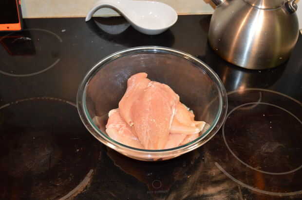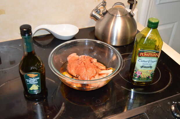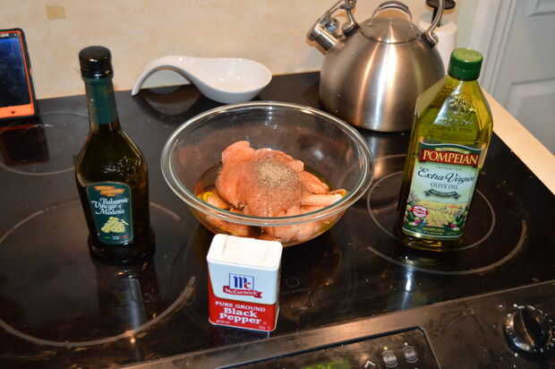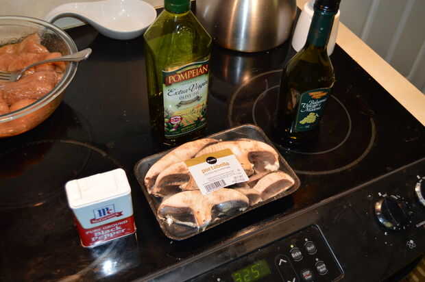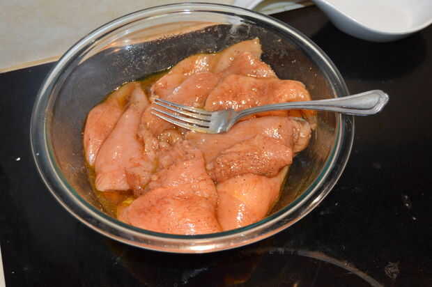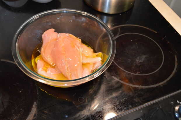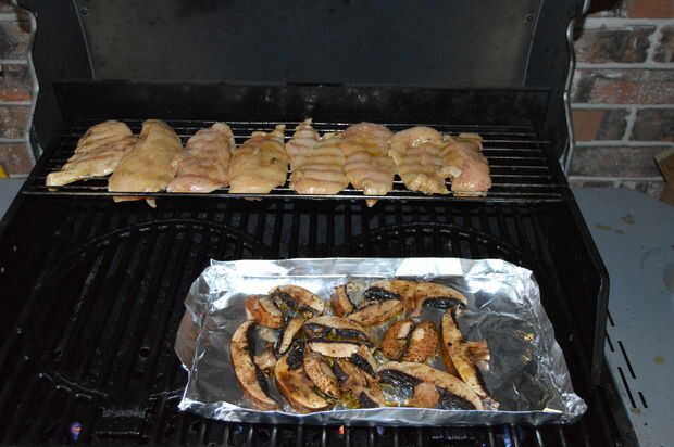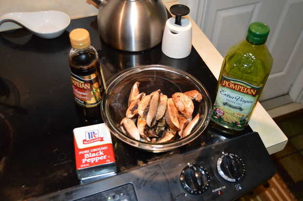 Marinar la pechuga de pollo en rodajas en un bol ligeramente los capa con aceite de oliva, vinagreta de balsámico y pimienta negra. Hacer lo mismo con las setas. Coloque ambos recipientes a un lado y pasar a los aguacates, bollitos y preparando para la parrilla.