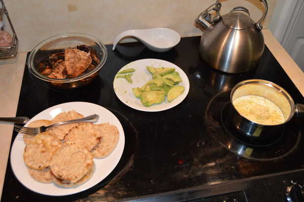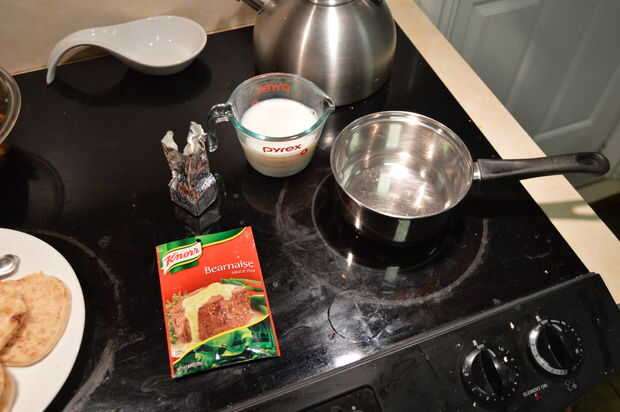 Por último cocinar la salsa bearnesa. Guardar este paso para el final porque se cocinan muy rápido y constantemente debe remover para que no se queme al fondo de la cacerola. El paquete utiliza llama para 1 taza de leche y 1/4 taza de mantequilla (cortar la mantequilla hasta 1/8 y estaba bien). Mezclar todos los ingredientes y paquetes contenidos en un recipiente. Llevar mezcla a ebullición, agitando constantemente. Una vez que hierva, retirar del fuego y seguir revolviendo hasta que ya no quiere pegarse al fondo de la cacerola.