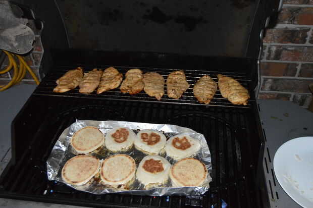 Coloque su bandeja de papel de aluminio en la rejilla inferior de la parrilla, vierta los champiñones junto con la marinada en la bandeja y se deja cocinar. A continuación, añadir la pechuga de pollo en la bandeja superior y cocine bien. Puesto que la pechuga de pollo finas en rodajas, el tiempo de cocción será más corto. No se olvide de mantener un ojo en las setas, porque si el aceite de cocina del balsámico comenzará a reducir y formar una capa gruesa de caramelo antes de empezar a grabar. Una vez terminados el pollo y los champiñones, pueden colocarlos en el mismo bol y apartar. Con la parrilla sigue en marcha, tomar los bollitos y tostar a la textura deseada.