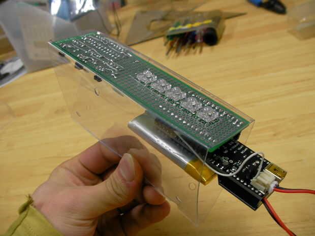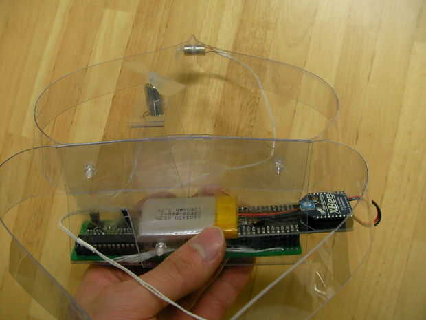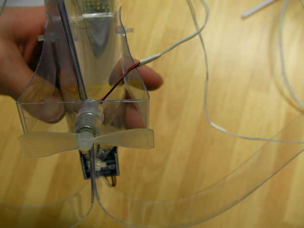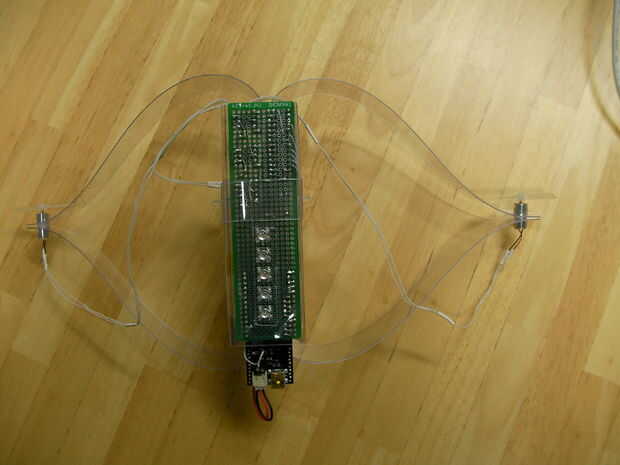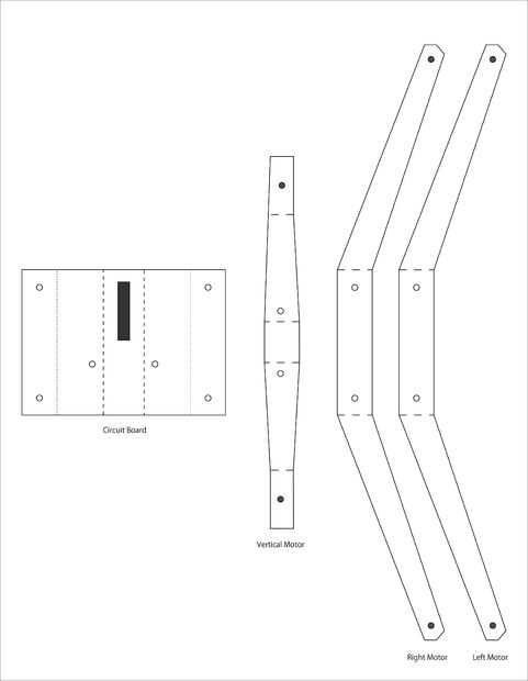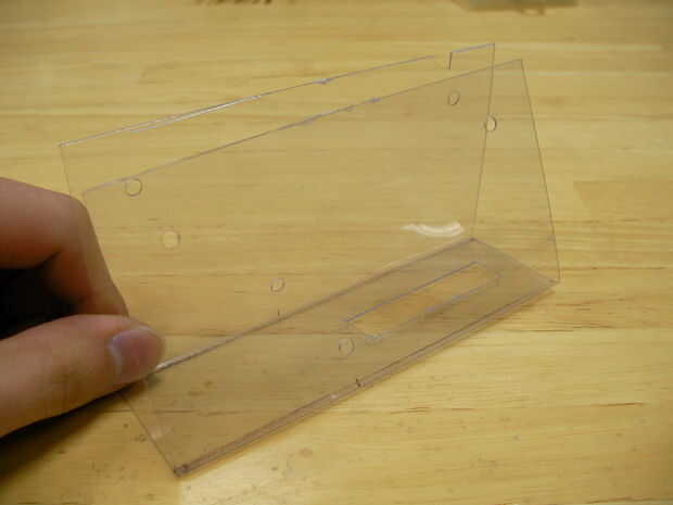 Cortar la lámina de plástico en las partes de la estructura, doblarlas y ponerlas junto con los tornillos. Mi dibujo de la estructura está incluido en el Beatfly_v1_001/Structure_Design/Structure_v1_001.jpg. Hacer su propio diseño para adaptarse a su circuito.