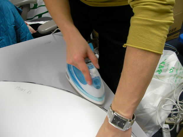 4. Selle el borde de dos piezas con hierro. Ajuste la temperatura de la plancha baja. Plancha demasiado caliente derretirá la película. Pruebe la temperatura antes de comenzar el sellado. Dejar unos 10 cm sin sellar para insertar la válvula de helio.