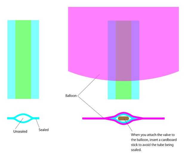 5. hacer la válvula. La válvula es simplemente un tubo pequeño de la misma película como el globo. Longitud de la válvula debe ser de 8 ~ 10 cm y el diámetro del tubo interno deben ser alrededor de 1 cm. Cuando conecta la válvula al balón utilizando hierro, insertar un palo de cartón en el tubo para evitar que el tubo se sella.