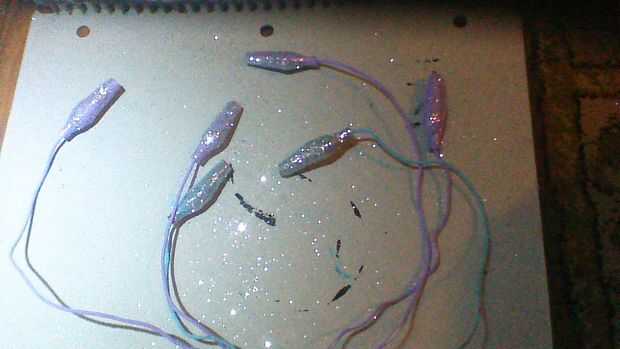 1. se comenzó pintando nuestros clips de cocodrilo. Hemos optado por pintar la banana 2 cocodrilo enchufes púrpura y la tercera verde azulado.