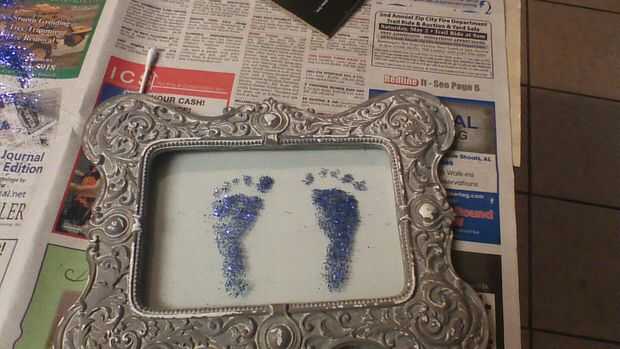 Poner la pieza limpia de vidrio en el marco y luego establecer la pieza decorada en la parte superior, para que las impresiones de brillo son sandwhiched entre el vidrio. Esto es para mantener brillo flojo caiga sobre ella. Doblar las puntas de la estructura juntos y listo! Ahora tienes dos pies bebé glittery para mostrar con orgullo.