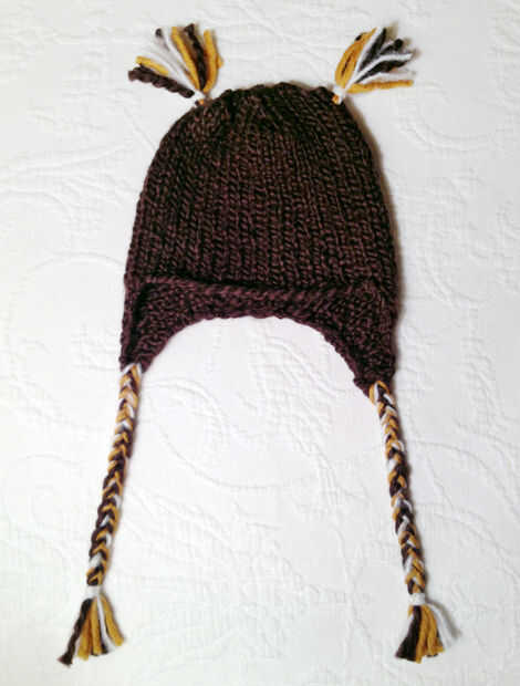 Para las colas, sacar piezas más largas a través de la parte inferior de las orejeras y trenza a su longitud deseada. Abrigo en la misma manera, knoting como envoltura hasta que esté muy seguro y los extremos a través de la ejecución.