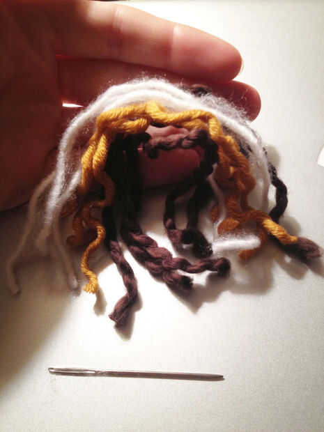 Para los oídos, tire varias hebras de cada color a través de una fila o dos de punto y Envuelva bien con otro pedazo de hilo, anudar varias veces mientras que por lo que se asegura firmemente. Ejecutar los extremos hacia arriba a través de la envoltura, para que no se peguen hacia fuera en direcciones extrañas.