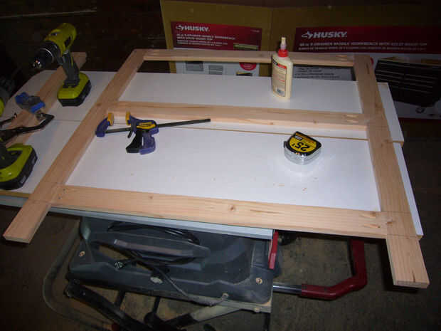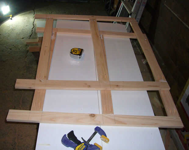-Montar la parte delantera y la espalda tirantes uniendo a las patas delantera y trasera con tornillos de bolsillo de 1 1/4" rosca gruesa