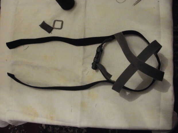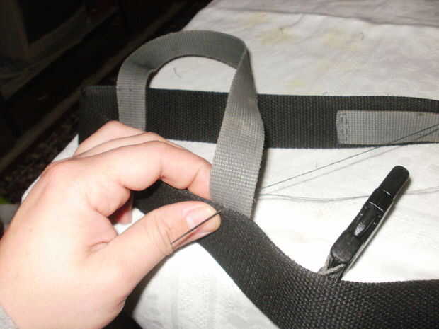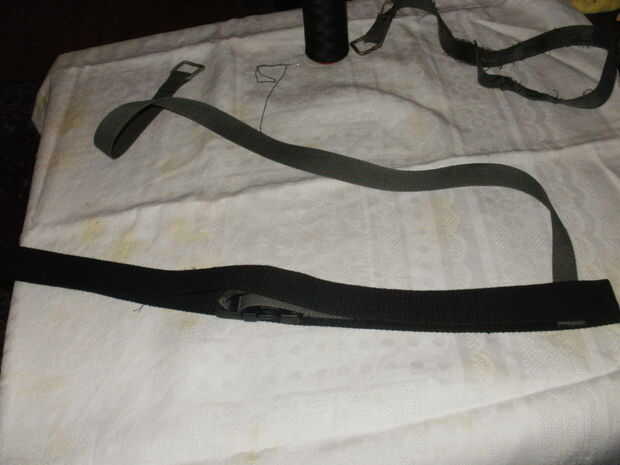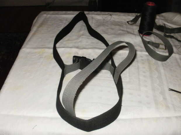 Después de que empecé a hacer los tirantes. medido para ser aproximadamente 30 cm. Esto fue suficiente no debe ser demasiado apretado o demasiado flojo. Dobló el cinturón más ancho para encontrar el centro y coser el primer extremo de la correa de unos 2 cm de él. El otro extremo que coser en el lado opuesto de la correa, justo antes de la pieza de sujeción. Del mismo modo lo hecho con la correa de hombro, formando una "x" cuando se mira desde arriba.