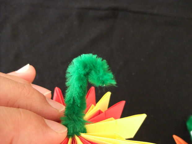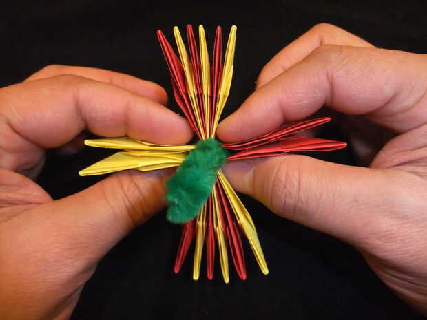 • Difundir los pétalos para formar un círculo. Sujetar los pétalos como se muestra en la imagen y pellizque cerca del limpiador de pipa. Repetir este proceso en otros pétalos (Nota: al final de este paso los pétalos pueden no ser igualmente espaciados)