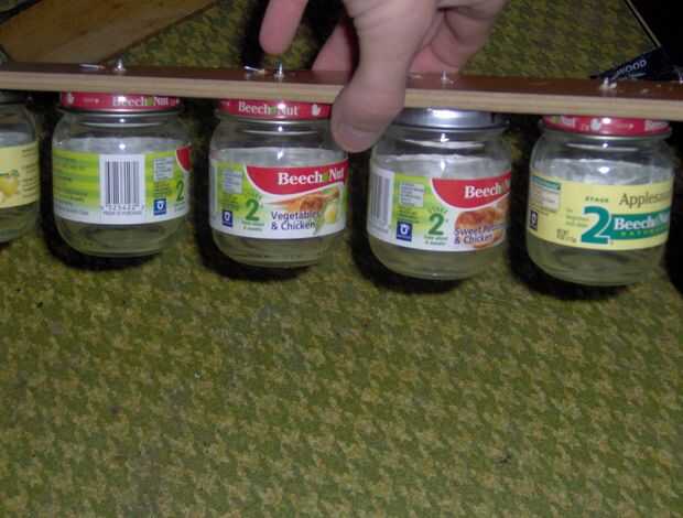Si usted utiliza otro pedazo de madera debajo de la primera, sáquelo. Doble sobre los clavos que se están pegando para arriba y un martillo hacia abajo. Ahora simplemente encontrar un lugar donde no golpear la cabeza o cualquier otra cosa en los frascos y, usando los agujeros perforados en la placa, atornillar el tablero lugar. Coloque los tarros en los párpados y disfrutar.